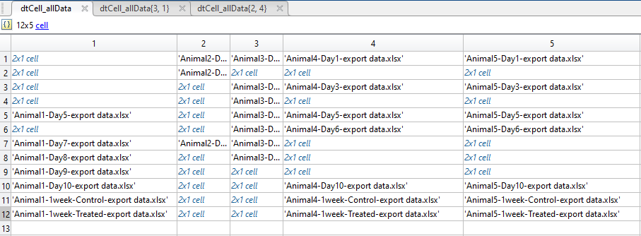 cell 타입 변수의 첫번째 열에는 Animal1의 Day1 부터 1week-treated 까지의 Excel 파일명을 담고,
