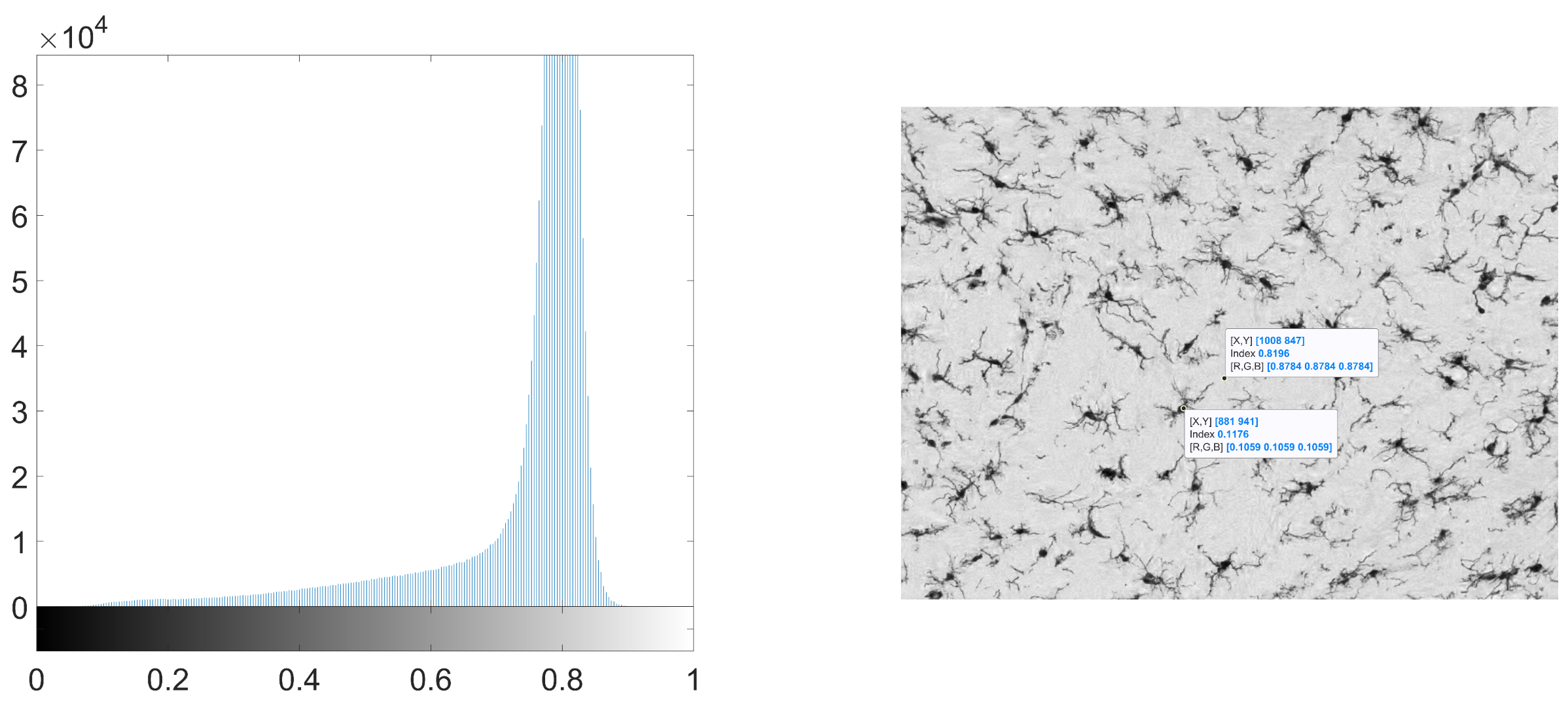 대비되는 microglial cell의 높은 픽셀값 분포를 위해, 이미지의 픽셀값 분포를 반전시켜야 합니다.