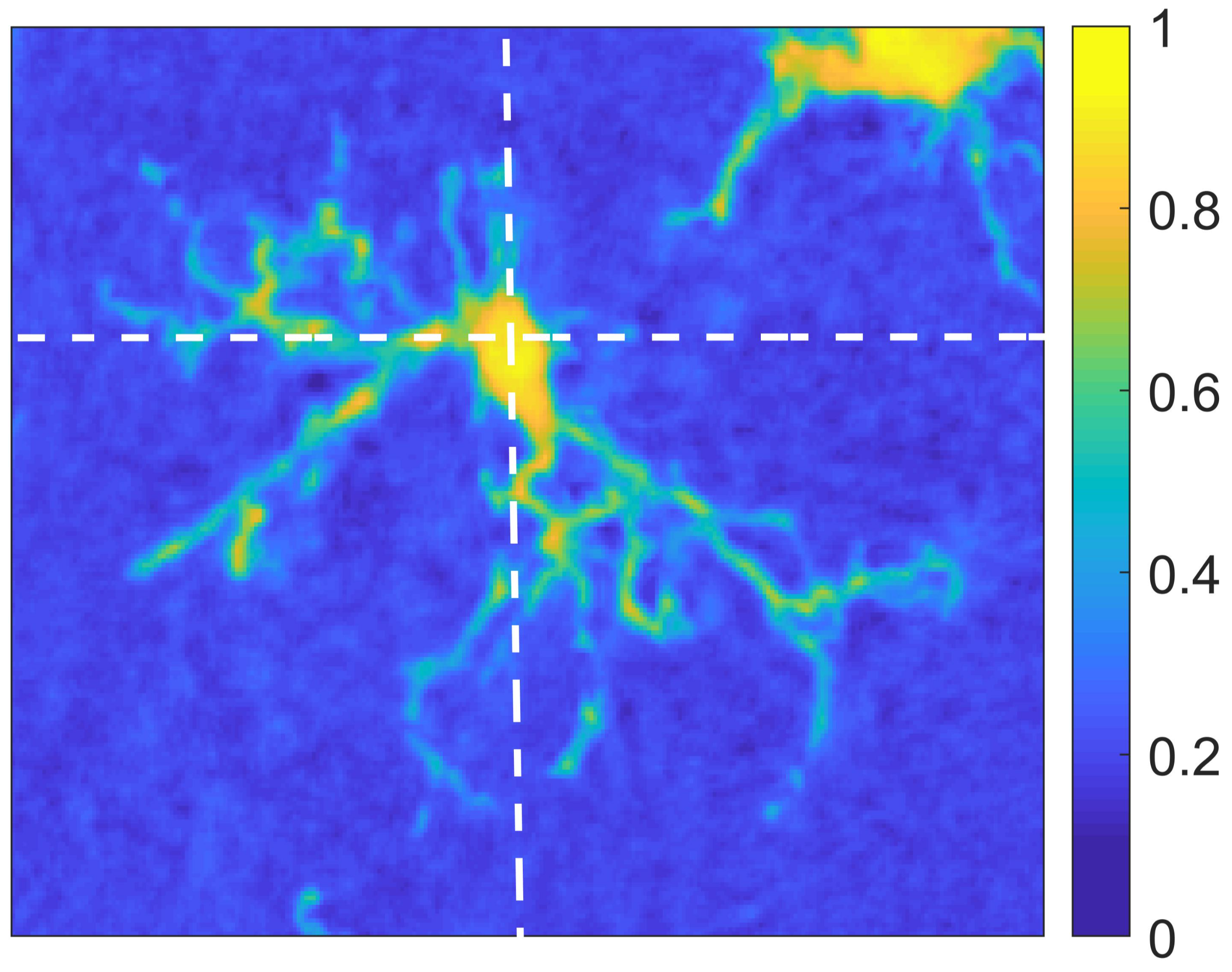 Cell의 soma 부분은 높은 intensity를 갖고 주변으로 갈수록 낮아짐을 볼 수 있습니다.