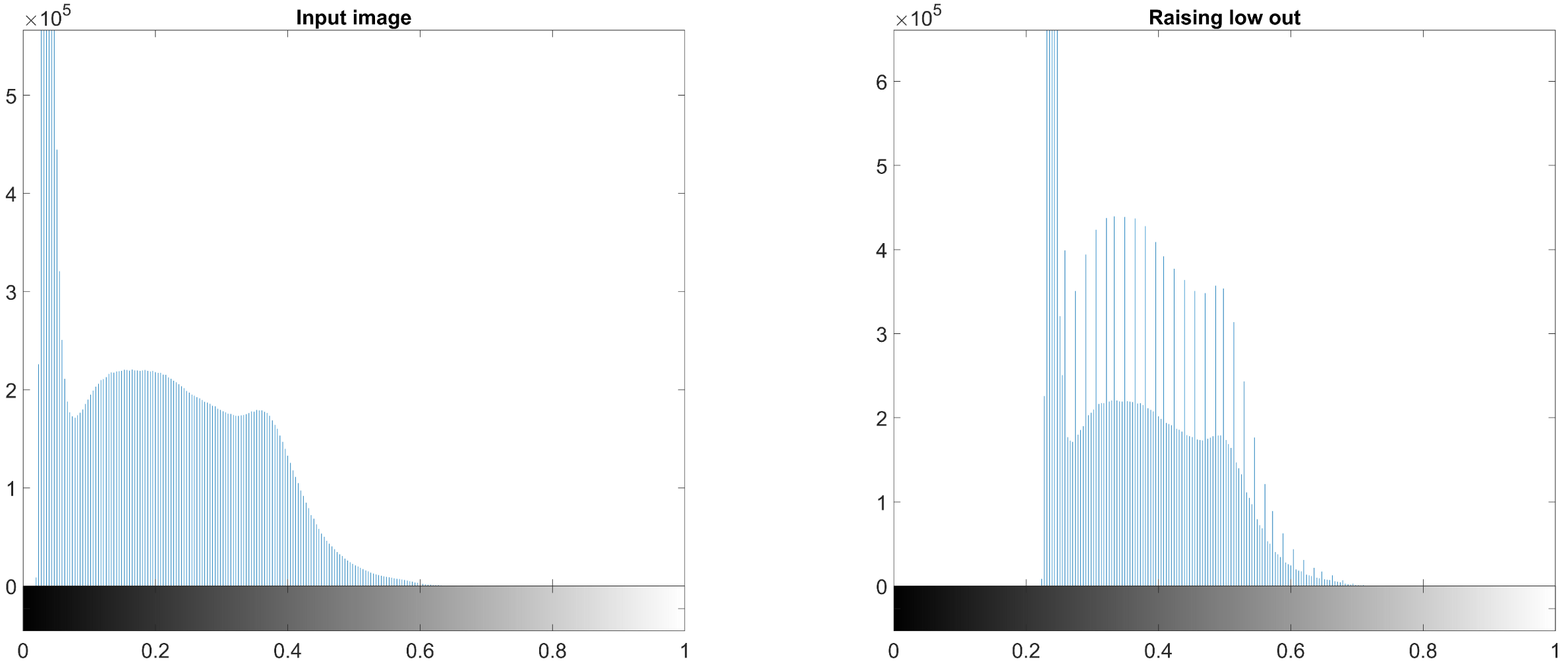 subplot(1,2,2); imhist(raise_low_out); title('\fontsize{20}Raising low out');