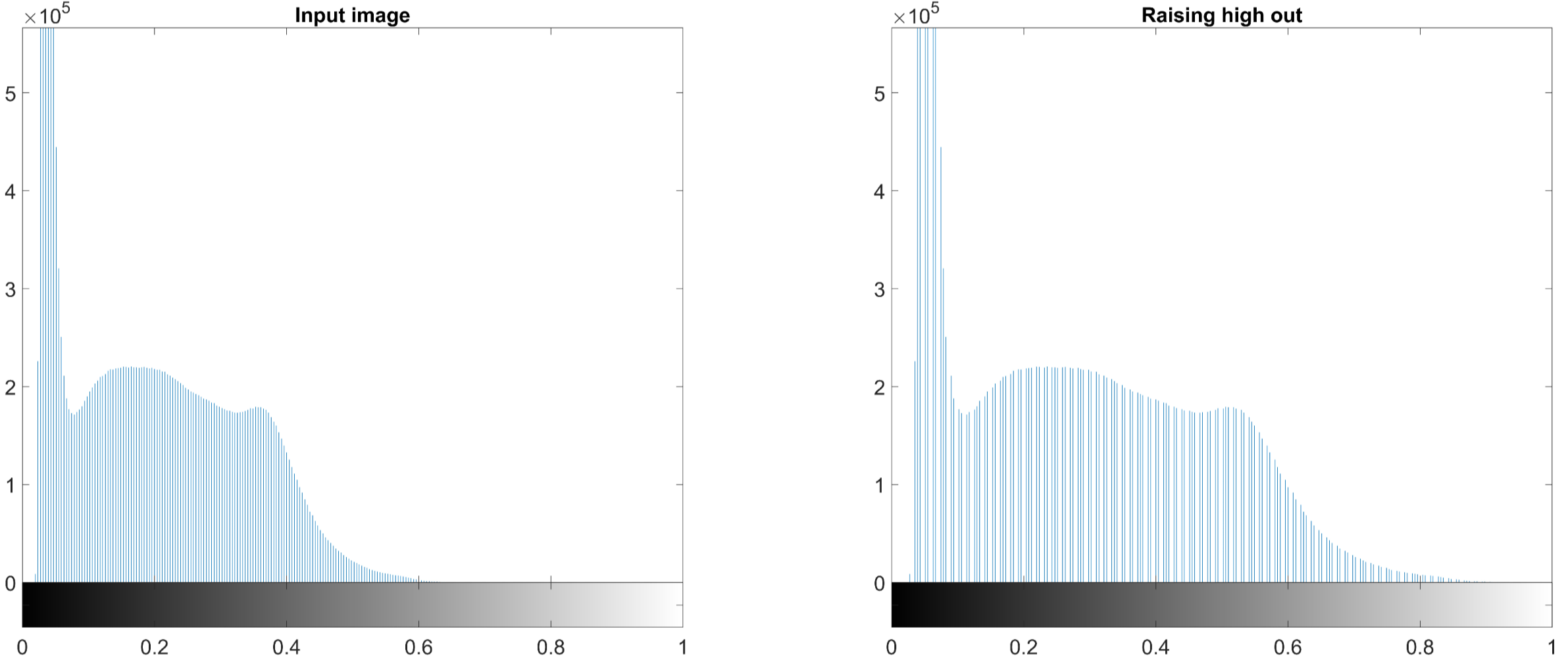 subplot(1,2,2); imhist(raise_high_out); title('\fontsize{20}Raising high out');