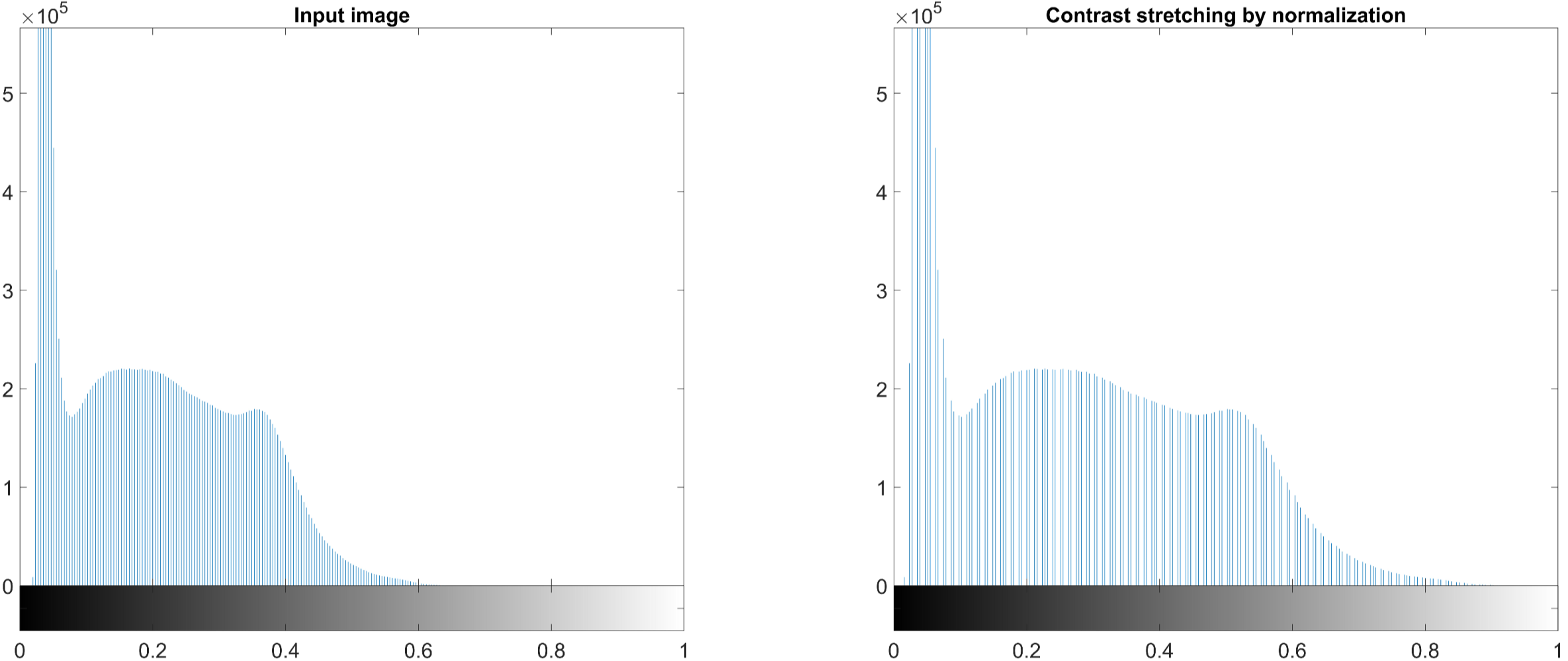 subplot(1,2,2); imhist(img_gray_result); title('\fontsize{20}Contrast stretching by normalization');