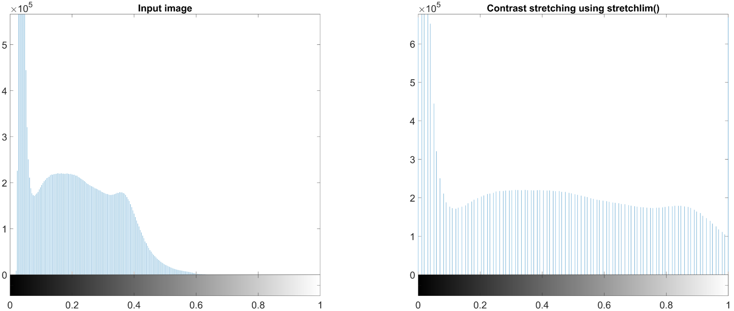subplot(1,2,2); imhist(img_gray_result2); title('\fontsize{20}Contrast stretching using stretchlim()');