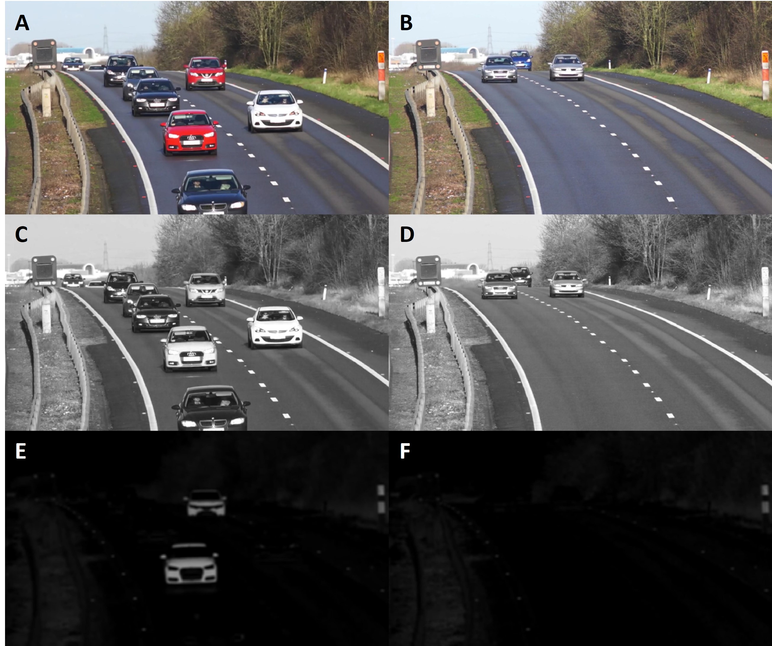 존재하지 않는 반면, A에는 두대의 빨간색 차량이 보이고 C에서 하얀색(Red 채널의 최고값