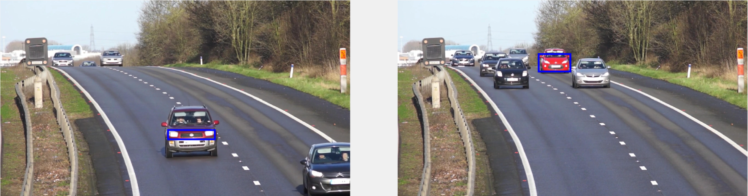 주행중인 빨간색 차량을 검출(detection/segmentation) 하고, 그것을 bounding box로