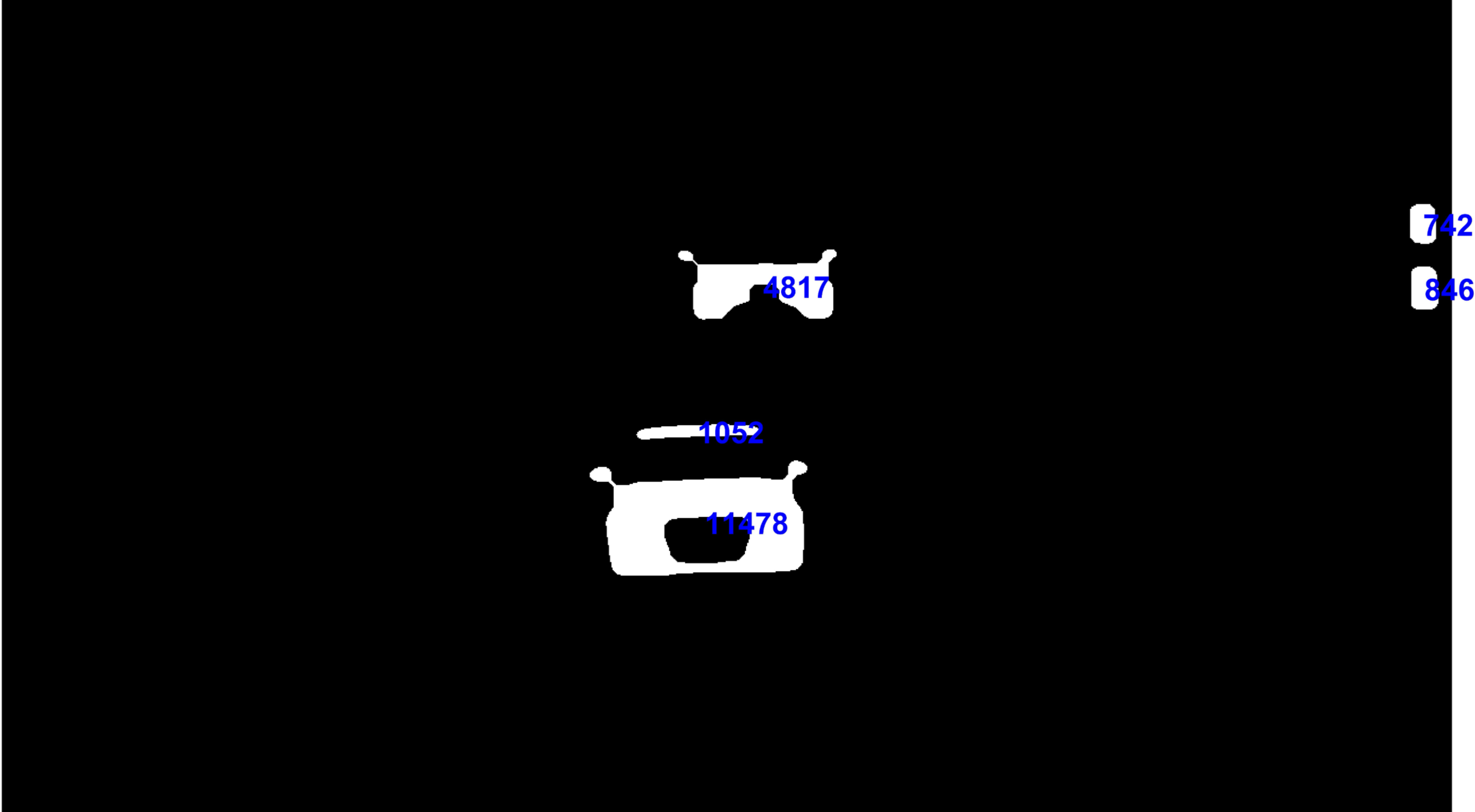 closing 결과에서 구해진 objects들의 면적(= 픽셀합)들을 각 centroid에 표시하였습니다.