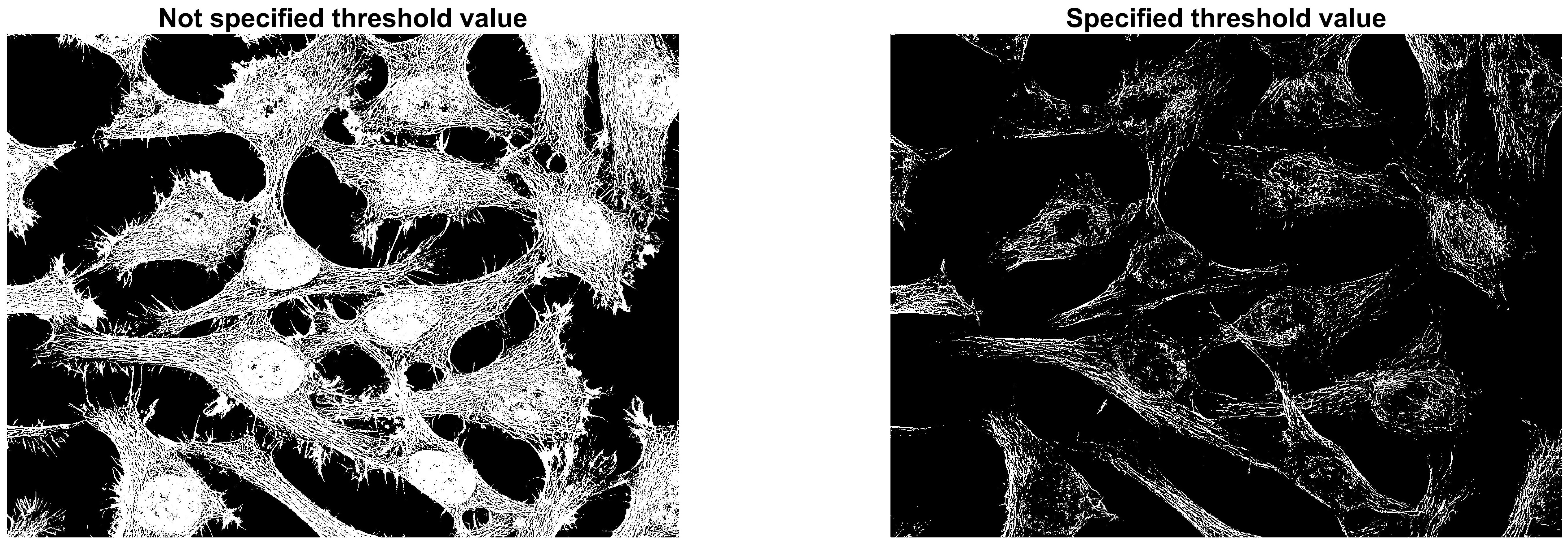 subplot(1, 2, 2); imshow(img_bw2); title('Specified threshold value');