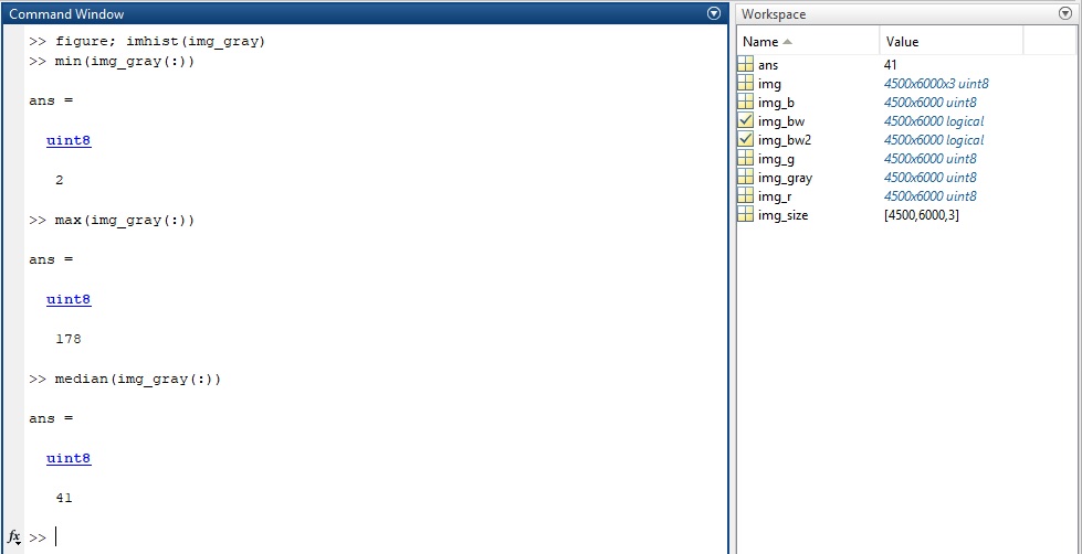특정 픽셀값을 알고자 하면 workspace의 대상 변수를 더블클릭 하여 알수 있으며 또한 Figure의 툴메뉴