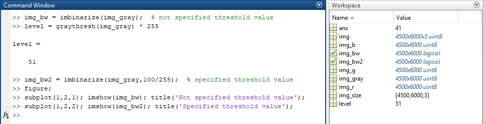 만일 원하는 threshold가 있다면 imbinarize( ) 함수의 입력 파라메터로 지정할 수 있습니다.