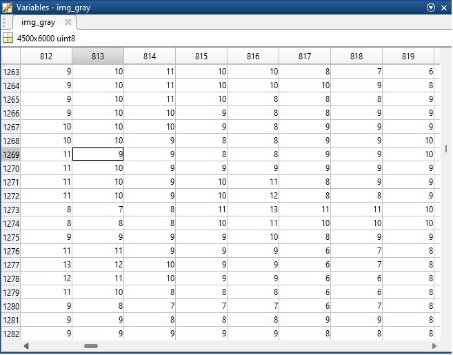 예를들어, 그레이스케일 이미지의 1269행 813열의 픽셀값은 uint8 형식의 9 입니다.