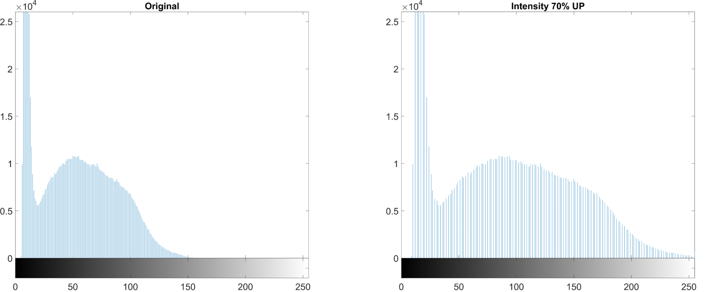 위의 histogram 에서 보듯이, 픽셀값 70% 상향시 픽셀값의 분포가 원래에 비해 우측으로 확장되었고,