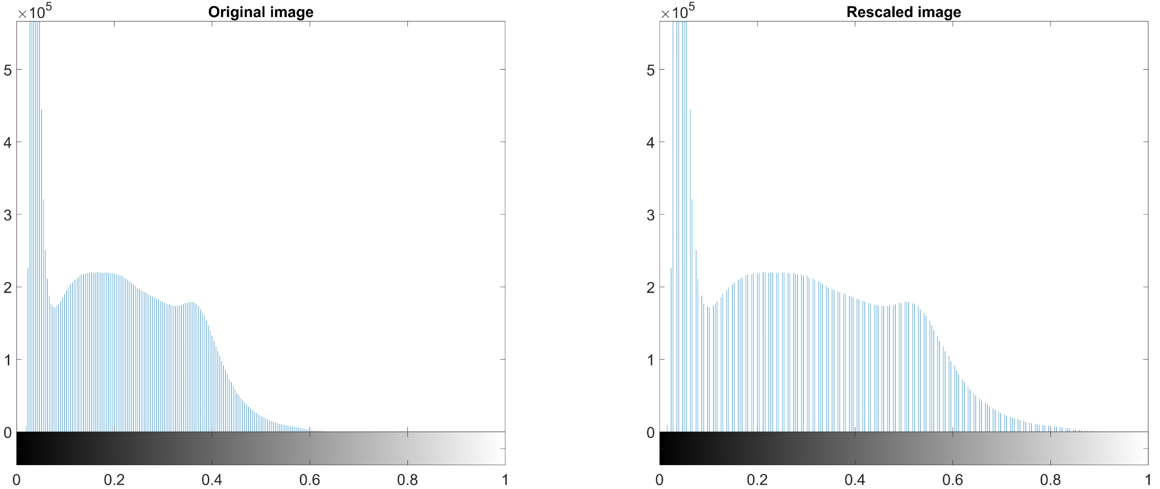 subplot(1,2,2); imhist(img_gray_normal); title('Rescaled image');