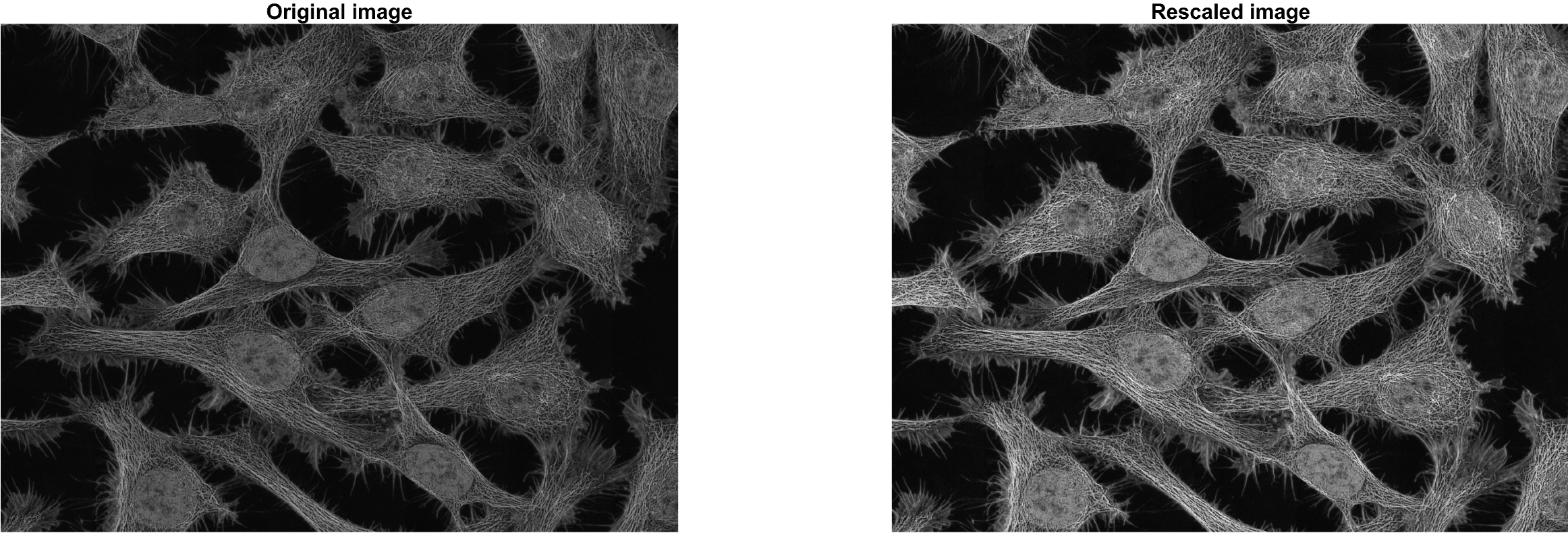 subplot(1,2,2); imshow(img_gray_normal); title('Rescaled image');
